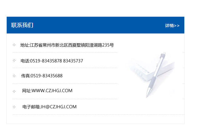 地址:常州市新北區友邦商務大廈1幢16、17層  電話:0519-85101652  傳真:0519-85112595  郵編:213022  網址:www.cz-jiayue_cn.2665pk.com  郵箱:xiajifengaa@163.com